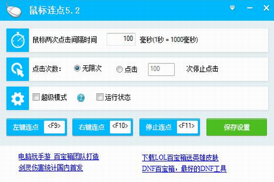 3、鼠标连点器还支持用于游戏的鼠标连续点击模式,即超级模式,在游戏中无法实现连点,请退出游戏,勾选“超级模式”并保存设置再进入游戏使用。