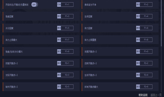 1、开启状态/天赋点/负重修改:开启后,打开物品栏[I]修改;负重修改,当前负重若超重,修改后丢弃1个物品更新负重,重新存读档还原负重。
