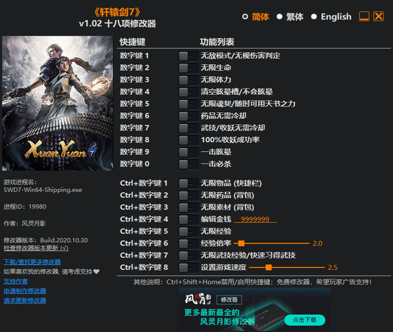 《轩辕剑7修改器》是一款功能强大的游戏辅助工具,可以改变游戏中的多项功能属性,拥有十八项强大的修改功能,比如:无敌模式、无限生命、无限体力、无限魂契、无限物品、无限药品、无限素材等等,可以帮助玩家们实现多种开挂功能,你想要的属性这里都有,通过使用这款修改器,你就可以更加轻松的体验游戏中的全部内容,帮助玩家大大降低游戏难度,让你非常轻松的就赢得战斗的胜利,更加无压力的完成游戏的通关。