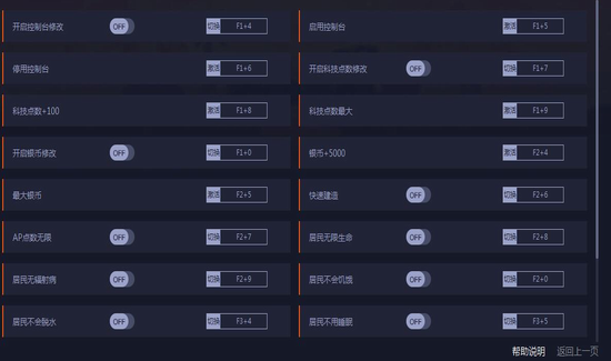 1、开启控制台修改:进入游戏场景后,开启"开启控制台修改"后,开启 "控制台可用"修改项,在游戏中按F10打开/关闭控制台界面。(资源添加[Resources-设置资源与数量-Add]/不用材料建造[General-Instant Building])。