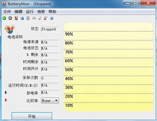 软件界面信息有电池状态、剩余百分比、运行时间、放电率等,有空的可以研究研究,简单粗暴型的直接看到左下的开始、结束两个按钮即可。纵坐标表示当前所剩电池电量百分比,横坐标表示电池使用时间。
