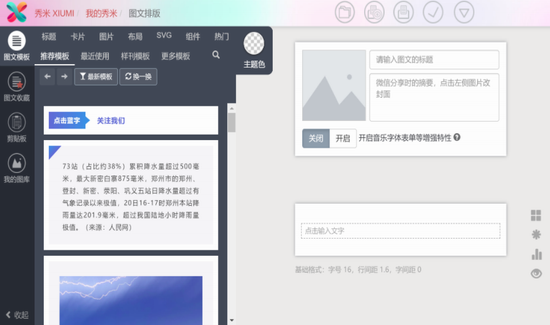 3、进入到具体编辑页面后,我们可以看到最左竖排有图文模板、旧模板、图文收藏、剪贴板、我的图库几大功能,在图文模板中我们可以编辑自己需要的风格文章排版。可设置模板样式、标题、图片、颜色等。