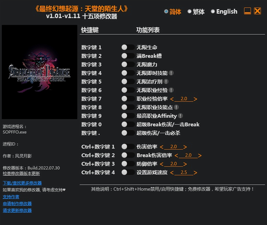 《最终幻想起源修改器》是一款根据同名游戏“最终幻想起源”改编制作而成的修改器,这款辅助工具内置了各种修改功能,其中就包括无限生命、无限魔力、无限治疗剂、无限即时技能等等,这样不仅可以减轻游戏的难度,还可以让你拥有更好的游戏体验;甚至连游戏的速度都可以进行自定义,比如当你的空闲时间不足时就可以点击加速游戏,这样就不会耽误你的正事,此外这里还需要提醒大家的是,当你借助最终幻想起源修改器开启“无限职业经验”修改时不会立马有效,当你进行杀怪获得经验时生效,其他有一些功能也是如此,比如无限生命,但是你的血条还是老样子显示,实际效果已经有了,这点大家无需去担心,可以使用。