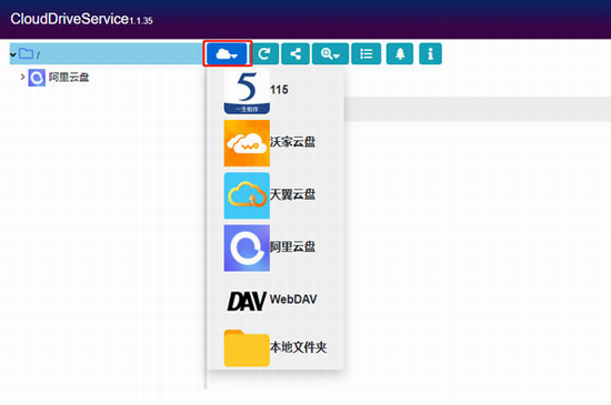 2、登录后左上角添加想要利用的云盘(有115 沃云盘 天翼云盘 还有阿里云盘 WebDAV);