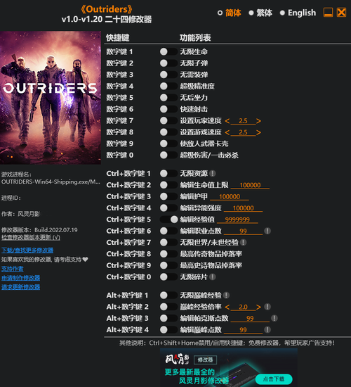 Outriders修改器 v1.0-v1.20 风灵月影版