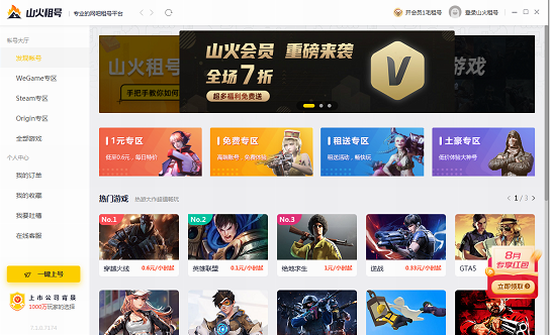 1、山火租号官网电脑版软件支持游戏租号功能。