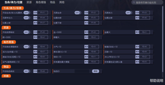 2、开启生命/体力/位置修改:控制角色时开启。位置修改在人物不移动时使用,位置修改完成后,移动使角色落下。