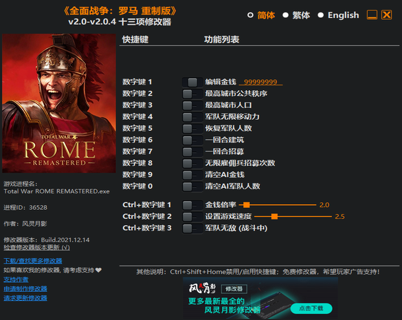 罗马全面战争重制版修改器 v2.0-v2.0.4 风灵月影版