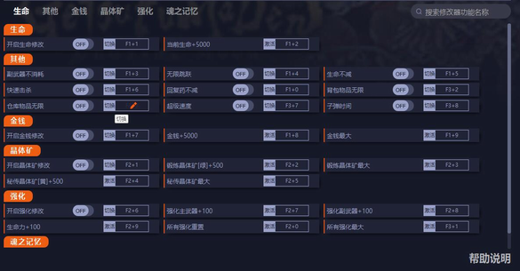 5、开启强化修改:开启后,打开菜单[Esc]修改,强化主武器/副武器可通过查看装备攻击确认是否修改成功,生命力修改后需在下次任意1项强化后更新。