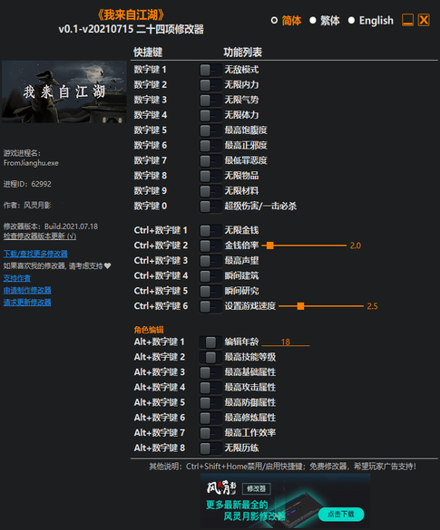 《我来自江湖修改器》是一款根据同名游戏“我来自江湖”改编制作而成的修改器,本修改器拥有无敌模式,无限体力,无限金钱,无限材料,无限物品,最高声望,瞬间研究,瞬间建筑等二十四项游戏数据修改功能,可以帮助用户进行更加畅快的游戏体验,在这个儿女情长,刀光剑影的世界中更舒畅的生存下去,此外在游戏中的所有武功除了某些神奇的物品外都是需要玩家自己一点点刷出来的,但有了本修改器就不一样了,直接打开最高技能修改选项,野球拳也好,降龙十八掌也罢直接满级,然后再在修改器内将自己的攻击,防御等基础属性直接调整成最高等级,看看江湖中还有谁是您的对手,出道就是颠覆,还不行的话打开无限材料,无限金钱,直接锻造出一把绝世好剑吧,进行那潇洒的江湖遨游。