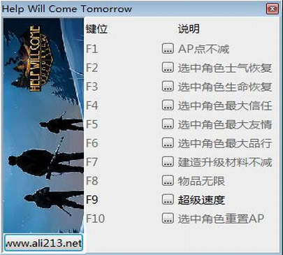 《明天会有救援修改器》是一款根据同名游戏“明天会有救援”改编制作而成的修改器,软件使用非常简单,玩家只需要登录游戏后再打开修改器,然后按下相对的热键即可快速得到AP点不减、选中角色士气恢复、选中角色生命恢复、物品无限、超级速度等十项游戏属性,以大幅度减少玩家的游戏困难,给玩家带来更好的游戏体验,并且这款辅助工具绿色小巧、一键解压,即玩即用,感兴趣的玩家快来下载体验吧。