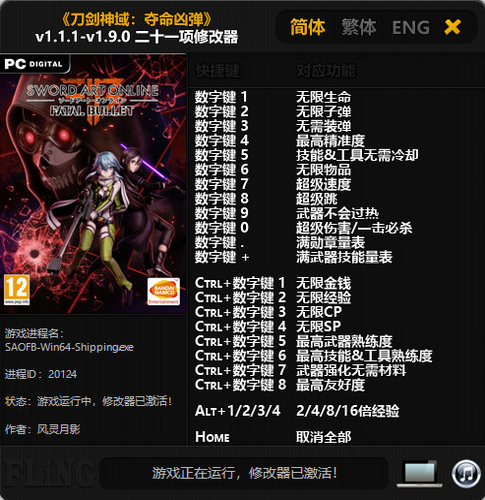 刀剑神域夺命凶弹修改器 v1.1.1-v1.9.0 风灵月影版