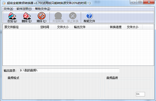 《音频格式转换器破解版下载安装》是一款功能强大实用且操作简单专业的音频文件转换工具,这款软件具有转换简单、快速等特点,可以支持批量添加文件转换,能够将目前主流的音频视频格式如MP3、MP2、OGG、APE、WAV、WMA、AVI、RM、RMVB、ASF、MPEG、DAT、3GP、MP4等转换成MP3/WAV/AAC/WMA/AC3音频文件,并且这款软件还可以让用户从视频文件中提取音频文件,并进行批量的转换操作,也可以从整个媒体中截取出部分时间段,转成一个音频文件,非常实用,此外这款软件还能够从视频文件中提取音频文件,并进行批量的转换操作,也可以从整个媒体中截取出部分时间段,转成一个音频文件,感兴趣的用户快来下载体验吧。
