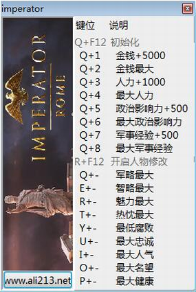 《大将军罗马修改器》是一款根据战争策略类游戏“大将军:罗马”改编制作而成的修改器,本修改器拥有最大影响力,最大军事经验,最大人气,金钱+5000,人力+1000,魅力最大,最大名望等十七项游戏数据修改功能,可以帮助用户在这个如中世纪一般的世界中,进行一统天下的霸业,此外在游戏内玩家需要在极短时间内将国家扶持到良性循环当中,并且扩大自己的军事武装力量,以用于抵抗周围国家的入侵,当然将那些流离失所的民众给聚集起来,产生出更大的资源也是您需要考虑的,不过现在您只需要点击修改器中的金钱最大功能以及最大人力功能就可以在极短时间内征服整个世界,进行最为爽快的游戏体验。