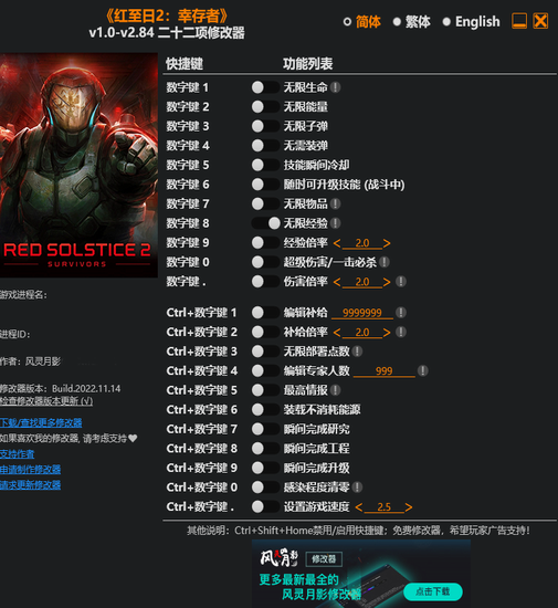 《红至日2幸存者修改器》是一款根据同名游戏“红至日2:幸存者”改编制作而成的修改器,在这款游戏中你需要和你的小队与怪物作战,期间需要根据小队成员不同的职业专长来制定详细的作战方案,以达到事半功倍的效果,为了让玩家可更好的体验这款游戏,本次带来了“红至日2幸存者修改器”这款辅助工具,本修改器拥有无限生命、无限能量、无限子弹、无限装弹、技能瞬间冷却、无限物品、无限经验、无限部署点数、瞬间完成研究、瞬间完成工程、瞬间完成升级等等二十二项修改功能,感兴趣的玩家快来下载体验吧。