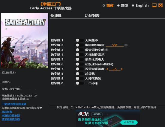 幸福工厂修改器风灵月影版功能介绍: