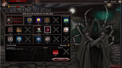 3、获取新的随机技能、奖励和小饰品以度过夜晚,在来访商户处购买需要的物品。