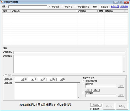 优易电子提醒簿是一款很好用的个人助手,可以完成记事、闹钟定时、日程提醒以及对这些项目进行管理的功能,闹钟可以播放指定音乐或运行指定程序。