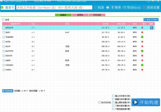 3、对于NTFS格式的硬盘,使用与Everything相同的算法进行建立索引,快速索引需要200M内存空间,并更占用CPU,但比慢速算法快至少10倍。