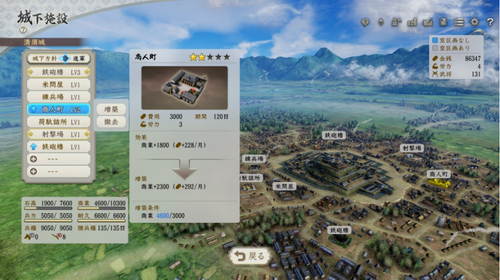 7、城下设施是会对影响据点产生整体影响的建设,虽然建设城下设施需要花费大量的金钱及劳力,然而却能够得到金钱及兵粮收入、以及最大兵力增加等,根据所建设的设施,将可得到各种不同的效果。