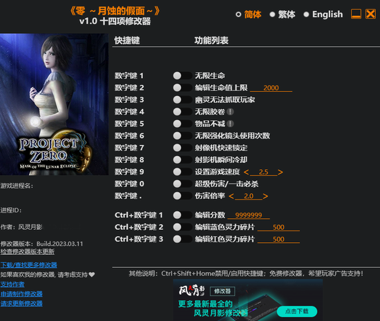 《零月蚀的假面修改器》是一款根据同名游戏“零:月蚀的假面”改编制作而成的修改器,在这款游戏中,玩家可利用拥有能够将怨灵封印能力的照相机“摄影机”,和各种各样的灵战斗,月、假面、岛内的房屋以及医院、谜样的仪式、各种各种事件的重叠,探索充满恐惧感的世界,遗留的便条以及日记、新闻纪实的片段、当时的事件、现在的谜题,都需要玩家去解明,为了让玩家可更好的体验这款游戏,本次带来了“零月蚀的假面修改器”这款辅助工具,本修改器拥有无限生命、无限胶卷、物品不减、无限强化镜头使用次数、射影机瞬间冷却、一击必杀等等十四项修改功能,感兴趣的玩家快来下载吧。