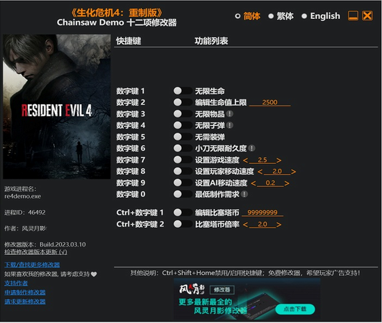 《生化危机4重制版修改器》是一款功能同名游戏“生化危机4重制版”改编制作而成的修改器,这款游戏都会带你领略这款完美融合恐怖、冒险与动作元素的经典之作,引领你亲眼见证里昂从初出茅庐的警察到总统直属特工的华丽蜕变,欣赏艾达那身着紫红色旗袍令人魂牵梦萦的经典造型,忆起在生化粉丝之中人气颇高的反派角色克劳萨,为了让玩家可更好的体验这款游戏,本次带来了“生化危机4重制版修改器”这款辅助工具,本修改器拥有无限生命、无限物品、无限子弹、无需装弹、小刀无限耐久度、最低制作需求等等十二项修改功能,感兴趣的玩家快来下载体验吧。