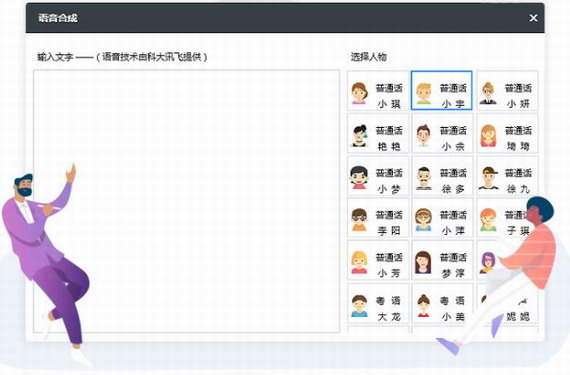 丰富的说话人物(男士、女士、儿童、卡通)可选、多种语言(普通话、英语、方言、粤语)设置增强内容表达效果。