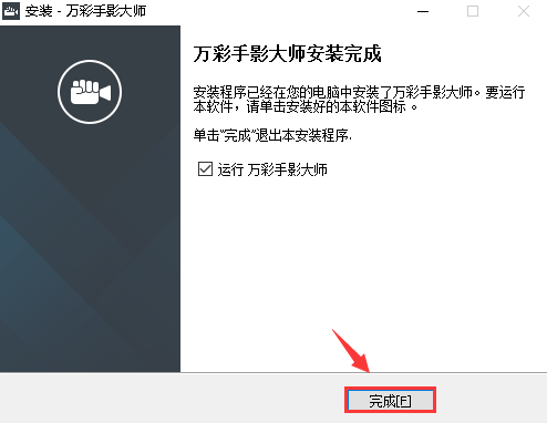 ⑨ 点击“完成”退出安装程序,电脑会自动启动安装完毕的万彩手影大师。