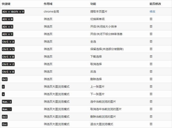 扩展包括三种提取模式,基本模式"提取本页图片"(默认快捷键:Alt + Shift + Y),加强模式"&预取链接"、"&分析预取数据",后续提取模式是其前述提取模式的延伸。其中"提取本页图片"仅针对本页面中图片标签、标签背景图片及其他方式加载过的图片,"&预取链接"会在此基础上对页面中的链接进行预取操作以获取更多的图片数据,"&分析预取数据"会在"&预取链接"的基础上对预取数据进行进一步分析并偿试获取DOM中的图片数据(如果链接为网页)。