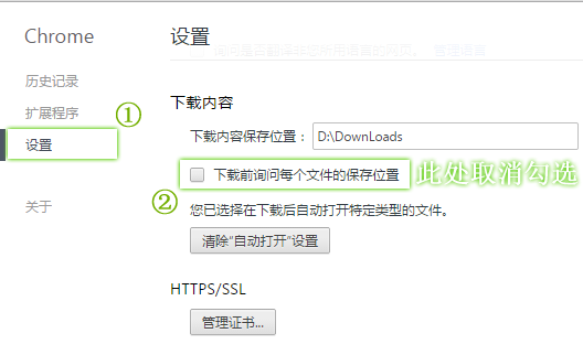 这是由于浏览器设置项"下载内容"中勾选了"下载前询问每个文件的保存位置"的缘故。该选项被勾选后,每个下载文件都会被要求手动确认,你可以取消该选项让浏览器每次都自动把文件存储到配置的特定位目录中。