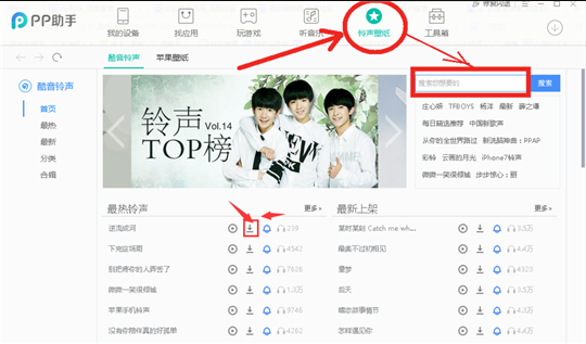 3、苹果设备成功连接后,因为我们要设置苹果铃声,所以点击PP助手界面的铃声壁纸选项,在界面下方的配音铃声选项中选择自己喜欢的类型,也可以直接在右上角的搜索框中输入想要的铃声然后点击搜索即可,找到铃声然后点击下载图标进行下载。