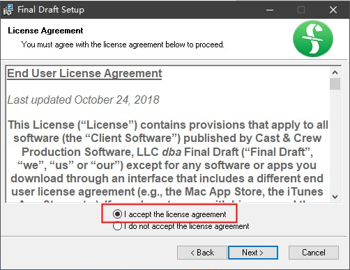 2、首先点击“FinalDraftSetup.msi”安装新版客户端程序,阅读并同意软件安装协议;