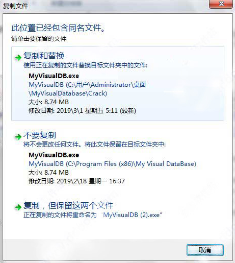 4、将破解补丁复制到软件根目录下,选择替换操作。默认路径为:C:\Program Files (x86)\My Visual DataBase