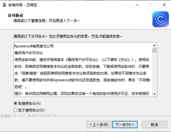 2、运行apowercompress.exe开始安装,阅读并接受条款,然后继续安装;