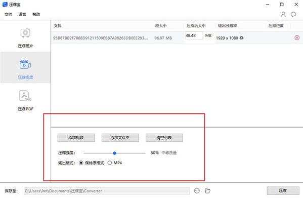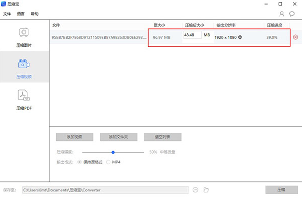 2、支持图片,视频和pdf压缩,以视频压缩为例,用户只需拖放文件到软件中,可以设置压缩选项;