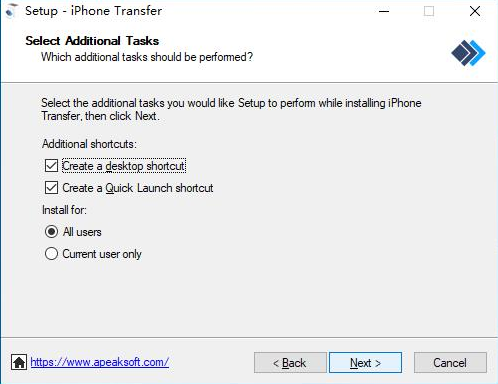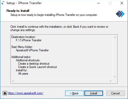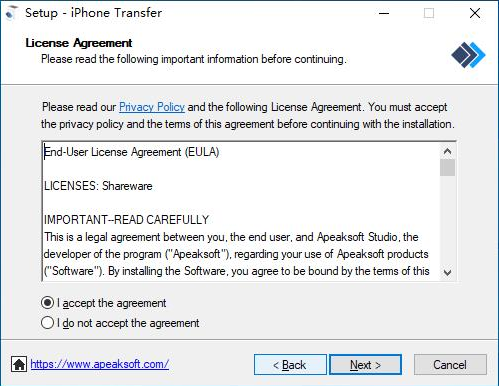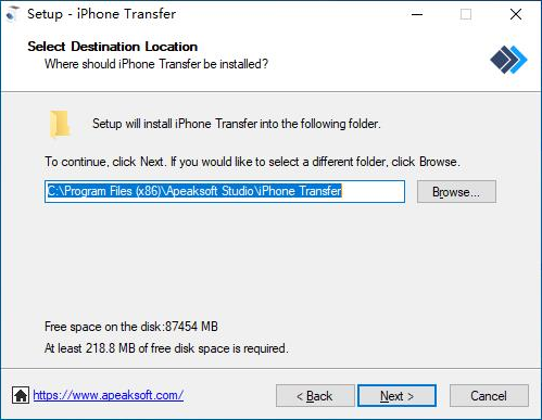 安装向导默认设置的软件默认安装路径为C:\Program Files (x86)\Apeaksoft Studio\iPhone Transfer