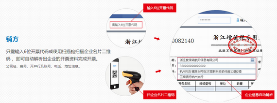 只需输入6位开票代码或使用扫描枪扫描企业名片二维码, 即可自动解析出企业的开票资料完成开票。