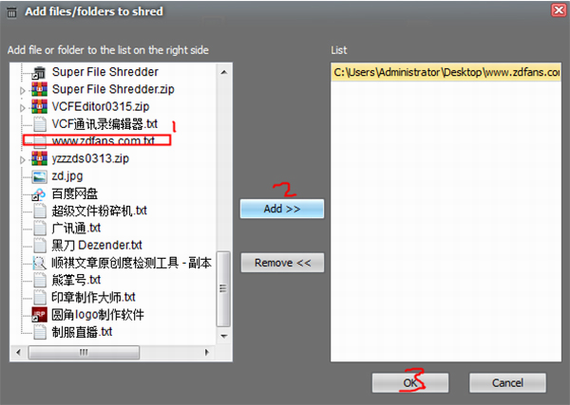 2、点击“+Add...”,在左边面板选择需要删除的文件,再次点击“Add>>”,选择完成后点击“OK”;