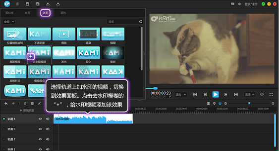 1、打开神剪辑,把有水印的视频导入到素材库中,然后再导入轨道中,选中视频,再点击上方的“效果”,在出现的功能中点击“去水印模糊”。