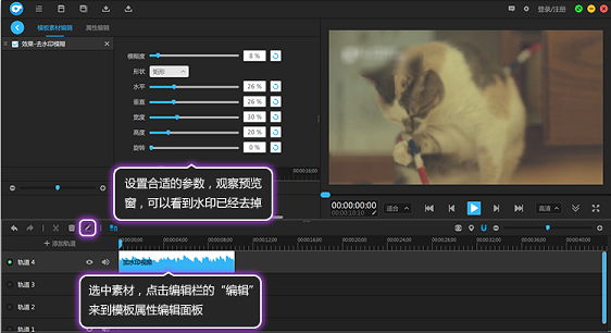 2、在选择视频,点击编辑栏的“编辑”按钮,打开模板素材编辑面板,输入去水印的参数,设置出适当的效果即可。