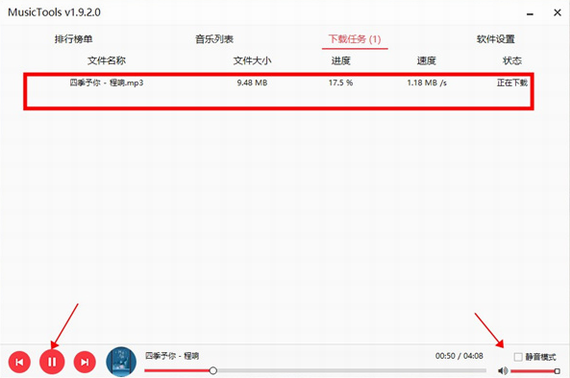4、在下载任务可以查看下载进度,也可以直接在线听歌,右下角可以设置静音模式