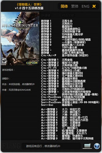 怪物猎人世界修改器最新版是专门为怪物猎人世界这款游戏所打造的,很多喜欢玩怪物猎人世界这款游戏的玩家都很喜欢使用这款游戏辅助,当我们在使用这款游戏辅助之后可以带来完全不一样的游戏乐趣,工具中包含了非常多的功能,比如无限生命、无限金币、无限物品、无限道具以及超级速度等等总共是有45项,每一项功能都有对应的快捷键,当我们需要使用某个功能的时候只需要按一下快捷键就可以了,操作起来更加的方便简单。
