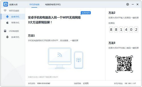 安卓手机和电脑在同一WiFi无线网络,可通过扫码、投屏码、同WIFI搜索连接进行投屏。