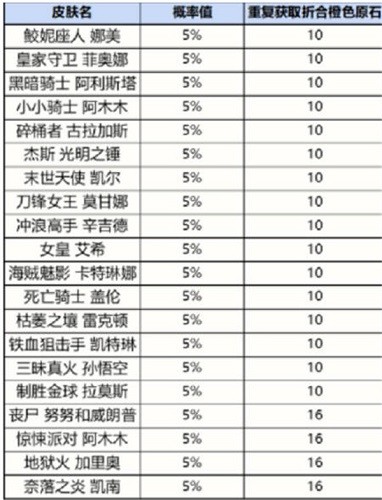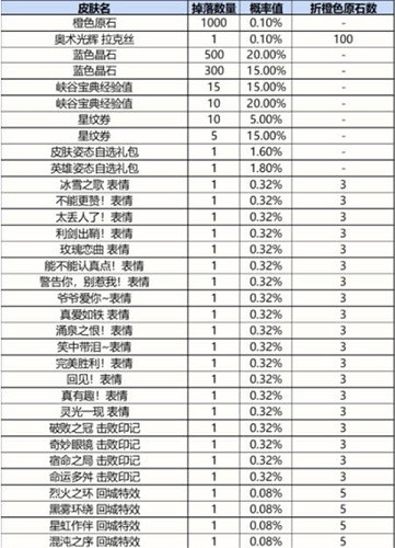 2:随机的奖励概率如图所示,只能随机获得一个奖励,奖励可以重复获得的,重复的奖励会自动分解为橙色原石