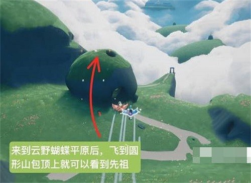 1:首先我们来到云野蝴蝶平原后面,我们飞到圆形的山包顶上,如图所示