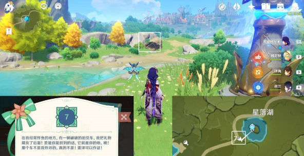 如下图所示,我们传送到星落湖的这个七天神像传送点这里,然后向西南方向看,就可以看到一个破旧的货车了,这里就是可莉所说的地方,我们靠近就可以找到此处的丰饶的祝愿宝箱。