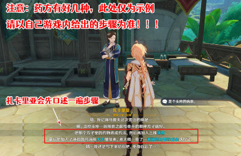扎卡里亚会根据不同的症状开出不同的药方,在给我们口述药方的时候,游戏内文本会用蓝色字体标注出药方的关键信息,我们要仔细记好步骤。(步骤有多种分支,下图仅为其中一种,要以自己游戏内遇到的为准!)
