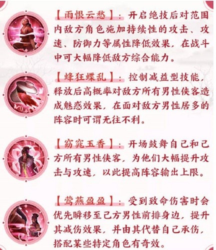 同时再面对致命危险的时候会寻求我方男性侠客代替承受伤害,绝技会对范围中的角色持续施加负面的效果