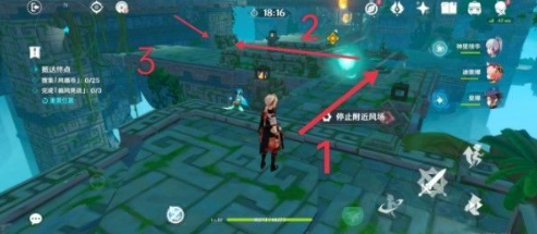 2.首先关闭附近风场。如下图箭头所示,沿路下楼,收集并完成挑战任务。