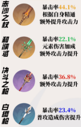 [决斗之枪]:大月卡武器,伤害最高的4星武器。454白值+36.8暴击;武器特效的加攻加防常驻触发。